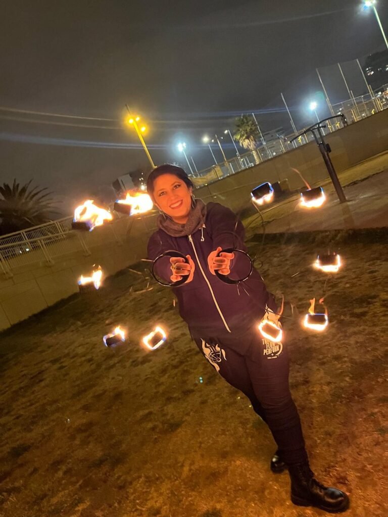 I am also a member of Akelarde, a company focused on fire props and flow arts, where movement, rhythm, and elemental work meet, deepening my relationship with props, presence, and performance in high-energy settings.